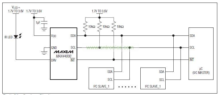 MAX44000设计用于驱动外部IR LED,工作在1.7V至3.6V VDD供电电源。只有环境光传感器工作时,器件消耗5µA电流,使能接近检测接收器和驱动器后,器件仅消耗7µA电流。