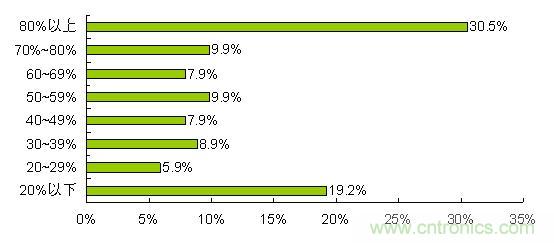 根据调查,89%的公司2011年传感器采购总额在5千万以下,其中采购总额在1千万以下的占到69%。采购传感器进口产品所占百分比呈现两极分化,进口产品所占百分比在80%以上和20%以下的情况最多,有30.5%的整机制造商传感器进口产品达到80%以上,19.5%的公司进口产品在20%以下。