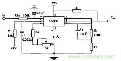 电阻Rs、R1、Rt和电容Ct直接影响转换结果Fout,因此对元件的精度要有一定的要求,可根据转换精度适当选择,其中Rt、Ct、Rs、R1要选用低温漂的稳定元件,Cin可根据需要选择0.1uF 或1uF 。电容C1对转换结果虽然没有直接的影响,但应选择漏电流小的电容器。电阻R1和电容C1组成低通滤波器,可减少输入电压中的干扰脉冲,有利于提高转换精度。电路中的47Ω 电阻对确保电路线性失真度小于0.03% 是十分必须的。