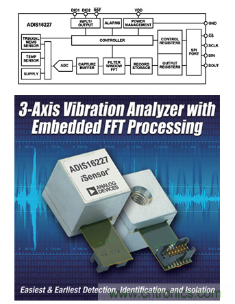 在一些应用案例中,相对简单的传感器输出可能就足够了,但在另一些应用中(例如,通过震动分析进行状态监控),则需要增加相当多的处理过程才能实现所需的输出。围绕惯性传感器而构建的一个高集成度器件示例是ADIS16227(见图2),它是一款完全自治的频域震动监控器。此类器件可能不提供相对简单的g/mV输出,而是提供特定应用分析。在本例中,其嵌入式频域处理、512点实值FFT和片上存储器能够识别各震动源并进行归类,监控其随时间的变化情况,并根据可编程的阈值做出反应。