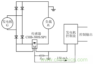 在某型地面车辆上装备了一套独立的大功率发电系统,该发电系统设计选用了CHB-300S型闭环霍尔电流传感器作为系统电流检测部件,通过对传感器的输出信号进行处理,设定限流工作点,确保发电系统的输出功率不高于发电机的额定功率。闭环霍尔电流传感器CHB-300S的应用,很好地实现了上述应用目的。如图3所示,发电机G输出正端汇流母线穿过CHB-300S/SP1的原边电流穿孔,由传感器CHB-300S/SP1检测发电机的输出电流,传感器的输出IM与发电机控制盒相连,由发电机控制盒设定发电机的输出电流控制点,依据此信号,对发电机的输出电流加以限制,避免发电机因输出功率过高而发生故障或损坏,从而保证发电系统正常工作。