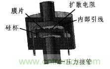 所设计的压阻式压力微传感器,其制法是将N型硅腐蚀成厚10~25μm的膜片,并在一面扩散了4个阻值相等的P型电阻。硅膜片周边用硅杯固定,则当膜片两面有压力差时,膜片即发生变形,从而导致电阻变化。用微电路检测出这种电阻变化,通过计算即可得出压力变化如图2所示。