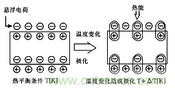 当一些晶体受热时,在晶体两端将会产生数量相等而符号相反的电荷,这种由于热变化产生的电极化现象,被称为热释电效应。通常,晶体自发极化所产生的束缚电荷被来自空气中附着在晶体表面的自由电子所中和,其自发极化电矩不能表现出来。当温度变化时,晶体结构中的正负电荷重心相对移位,自发极化发生变化,晶体表面就会产生电荷耗尽,电荷耗尽的状况正比于极化程度,图1表示了热释电效应形成的原理。