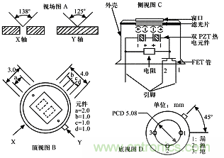 人体都有恒定的体温,一般在37°C左右,会发出10mm左右特定波长的红外线,被动式红外探头就是靠探测人体发射的红外线而进行工作的。红外线通过菲涅耳滤光片增强后聚集到热释电元件,这种元件在接收到人体红外辐射变化时就会失去电荷平衡,向外释放电荷,后经检测处理后就能产生报警信号。被动红外探头,其传感器包含两个互相串联或并联的热释电元件,而且制成的两个电极化方向正好相反(如图2侧视图C),环境背景辐射对两个热释元件几乎具有相同的作用,使其产生释电效应相互抵消,于是探测器无信号输出[3]。