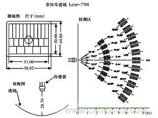 菲涅耳透镜(图3)根据菲涅耳原理制成,把红外光线分成可见区和盲区,同时又有聚焦的作用,使热释电人体红外传感器 (PIR) 灵敏度大大增加。菲涅耳透镜折射式和反射式两种形式,其作用一是聚焦作用,将热释的红外信号折射(反射)在PIR上;二是将检测区内分为若干个明区和暗区,使进入检测区的移动物体能以温度变化的形式在PIR上产生变化热释红外信号,这样PIR就能产生变化电信号。