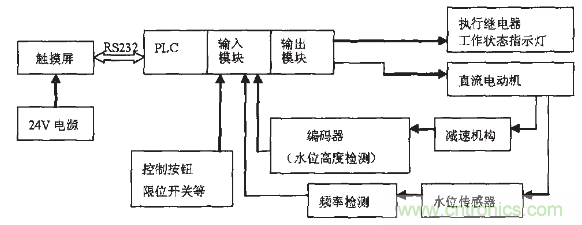 作为主电机的直流电动机由PLC进行控制,电机实现PID调速,电机的输出通过减速机构与执行机构相连,最后带动细钢管在水箱中上下移动来按检测要求控制管内水位高度的准确变化,通过编码器实现水位高度变化的实时检测,频率的实时检测由PLC的高速计数器来完成??刂泼畹氖淙虢覲LC的输入端,PLC的输出端接执行继电器和工作状态指示灯等。