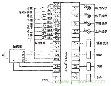 图2为PLC控制系统硬件接线图。输入X0~X1为编码器的A、B相输出脉冲信号,X3为振荡频率信号,X4~X14为按钮、选择开关、限位开关和计数开始等信号,输出Y0~Y7分别控制继电器、信号指示灯等。