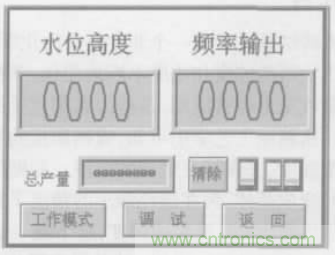 整个画面由两部分组成:一部分为显示画面,主要包括系统画面、测试系统的运行状态、水位高度显示、振荡频率输出、显示每天的总产量等画面,如图4所示;另一部分为参数设定画面,主要用来设定工作模式、水位分段上升、下降的数值等,如图5所示。