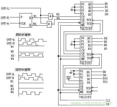 当光电编码器顺时针旋转时,通道A输出波形超前通道B输出波形90°,D触发器输出Q(波形W1)为高电平,Q(波形W2)为低电平,上面与非门打开,计数脉冲通过(波形W3),送至双向计数器74LS193的加脉冲输入端CU,进行加法计数;此时,下面与非门关闭,其输出为高电平(波形W4)。当光电编码器逆时针旋转时,通道A输出波形比通道B输出波形延迟90°,D触发器输出Q(波形W1)为低电平,Q(波形W2)为高电平,上面与非门关闭,其输出为高电平(波形W3);此时,下面与非门打开,计数脉冲通过(波形W4),送至双向计数器74LS193的减脉冲输入端CD,进行减法计数。