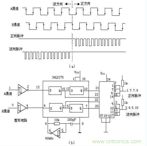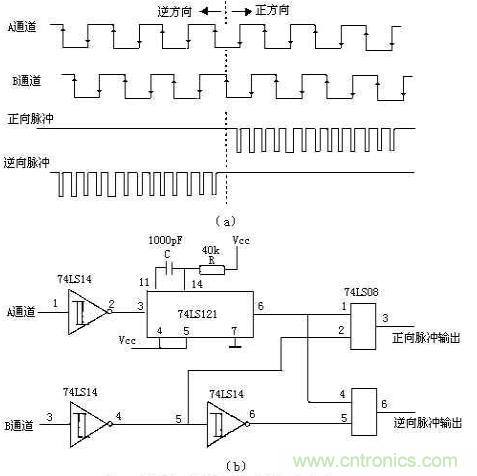 增量编码器是以脉冲形式输出的传感器,码盘比绝对编码器码盘要简单得多且分辨率更高。一般只需要三条码道,这里的码道实际上已不具有绝对编码器码道的意义,而是产生计数脉冲。它的码盘的外道和中间道有数目相同均匀分布的透光和不透光的扇形区(光栅),但是两道扇区相互错开半个区。当码盘转动时,它的输出信号是相位差为90°的A相和B相脉冲信号以及只有一条透光狭缝的第三码道所产生的脉冲信号(它作为码盘的基准位置,给计数系统提供一个初始的零位信号)。从A,B两个输出信号的相位关系(超前或滞后)可判断旋转的方向。由图3(a)可见,当码盘正转时,A道脉冲波形比B道超前π/2,而反转时,A道脉冲比B道滞后π/2。图3(b)是一实际电路,用A道整形波的下沿触发单稳态产生的正脉冲与B道整形波相‘与’,当码盘正转时只有正向口脉冲输出,反之,只有逆向口脉冲输出。增量编码器是根据输出脉冲源和脉冲计数来确定码盘的转动方向和相对角位移量。通常,若编码器有N个(码道)输出信号,其相位差为π/ N,可计数脉冲为2N倍光栅数,现在N=2。图3电路的缺点是有时会产生误记脉冲造成误差,这种情况出现在当某一道信号处于‘高’或‘低’电平状态,另一道信号正处于‘高’和 ‘低’之间的往返变化状态,此时码盘虽然未产生位移,但是会产生单方向的输出脉冲。例如,码盘发生抖动或手动对准位置时(下面可以看到,在重力仪测量时就会有这种情况)。