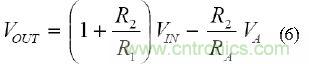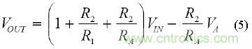 注意,从VA至输出的增益为反相。VA的增加会使输出电压降低,比值为R2和RA之比。此比值下,可以针对给定的输入失调,使调整范围达到最大。由于调整范围指向增益之前的放大器输入,因此,即使在低分辨率源的情况下,也可实施微调。由于RA一般都比R1大得多,因此,我们可以得到等式(5)的近似值: