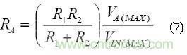 为了找到一个RA值以允许最大失调调整范围VIN(MAX), 在给定调整电压范围VA(MAX)的情况下,使VOUT=0,求RA,结果得到