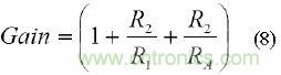 其中, VIN(MAX)为传感器预期的最大失调。等式(5)同时显示, 调整电路的插入会修改从输入到输出的增益。即使如此,其影 响一般也很小,增益可以重新计算为: