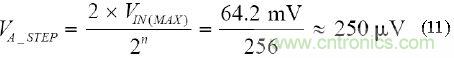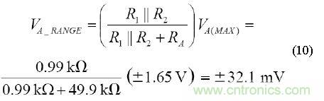 由于DAC可以摆动±1.65 V,因此,总失调调整范围可通过由RA 以及R1和R2的并联组合形成的分压器给定,其计算方法如下: