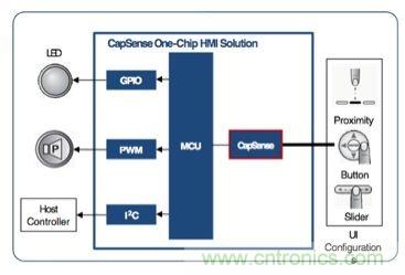 电容式接近感应优于其它技术的主要原因之一是能够实现的集成度水平。电容式接近感应解决方案基本上可以集成诸如触摸按键和滑条等用户界面功能。与采用移动机械部件的更复杂系统相比,这些功能不但易于实现,而且时尚美观。