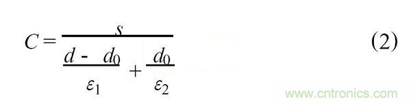 式中,S为极板相互遮盖面积,单位为m2;d为两平行板间的距离,单位为m;ε为极板间介质的介电常数;εr极板间介质的相对介电常数;ε0真空的介电常数。从上式可以看出,当d小时可使电容量增大,而使灵敏度增加,但d过小容易引起电容器击穿,一般我们可以采取在极板间放置云母来改善,此时电容C为两电容串联,可写成: