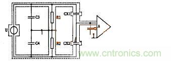 第三个问题是分布电容的影响。由于电容传感器一个很关键的问题是分布电容电容量与传感器电容量相比不仅不能忽略,而且影响还极其严重,其后果是造成传输效率降低、灵敏度下降、测量误差增加及稳定性变差。近几年来,对此问题有了新的解决途径。其中“整体屏蔽法”就是一例,以差动电容传感器为例,说明整体屏蔽法,在下图中,CX1、CX2为差动电容,U为电源,A为放大器,整体屏蔽法是把整个电桥(包含电源电缆等)一起屏蔽起来,设计的关键点在于接地点的合理设置。采用把接地点放在两个平衡电阻R1、R2之间与整体屏蔽共地,这样,传感器公用极板与屏蔽之间的分布电容C1与放大器的输入阻抗并联,从而可把C1视作放大器的输入电容。由于放大器的输入阻抗有极大值,C1的并联也不希望存在,但它只影响灵敏度而已,另外两个分布电容C3、C4并联在桥臂R1、R2上,会影响电桥的初始平衡和整体灵敏度,并不影响电桥的正常工作。因此,分布参数对传感器电容的影响基本消除,整体屏蔽法是解决电容传感器分布电容问题的很好方法,缺点是使结构复杂。