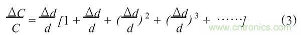 最后要说明的是关于非线性的问题。由下图我们可以看到变间隙式电容传感器相对输出表达式为: