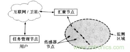 典型的无线传感器网络结构如图1。在监测区域内布置大量传感器节点,节点间采用自组织方式进行组网以及利用无线通信技术进行数据转发,每个节点都具有数据采集与数据融合转发双重功能。节点对本身采集到的信息和其它节点转发给它的信息进行初步的数据处理和信息融合之后以相邻节点接力传送的方式传送到基站,然后通过基站以互联网、卫星等方式传送给最终用户。