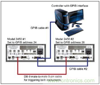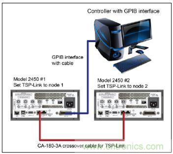 对于计算机与2450型仪器的GPIB通信,只需要1根电缆,实现GPIB接口与2450型仪器IEEE-488接口的连接(图8中2450型#1)。将2450型#1的TSP-Link节点设为节点1,将2450型#2的TSP-Link节点设为节点2。