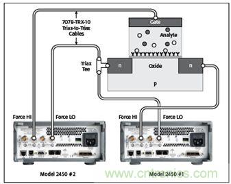图10:测试三端BioFET时两部2450型仪器配置