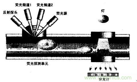 发光频率为f的激光经透镜,光纤被送到表皮组织。对于不动的组织,例如血管壁,所反射的光不产生频移;而对于皮层毛细血管里流速为 的红细胞,反射光要产生频移,其频率变化为△f;发生频移的反射光强度与红细胞的浓度成比例,频率的变化值可与红细胞的运动速度成正比。发射光经光纤收集后,先在光检测器上进行混频,然后进人信号处理仪,从而得到红细胞的运动速度和浓度。