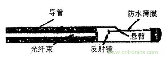 1、压力测量。目前临床上应用的压力传感器主要用来测量血管内的血压、颅内压、心内压、膀胱和尿道压力等。用来测量血压的压力传感器示意见图3。其中对压力敏感的部分是在探针导管末端侧壁上的一块防水薄膜,一面带有悬臂的微型反射镜与薄膜相连,反射镜对面是一束光纤,用来传递入射光到反射镜,同时也将反射光传送出来。当薄膜上有压力作用时。薄膜发生形变且能带动悬臂使反射镜角度发生改变,从光纤传来的光束照射到反光镜上,再反射到光纤的端点。由于反射光的方向随反射镜角度的变化而改变,因此光纤接收到的反射光的强度也随之变化。这一变化通过光纤传到另一端的光电探测器变成电信号,这样通过电压的变化便可知探针处的压力大小。