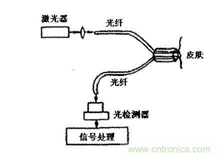 2、血流速度测量多普勒型光纤速度传感器测量皮下组织血流速度的示意见图4此装置利用了光纤的端面反射现象,测量系统结构简单。