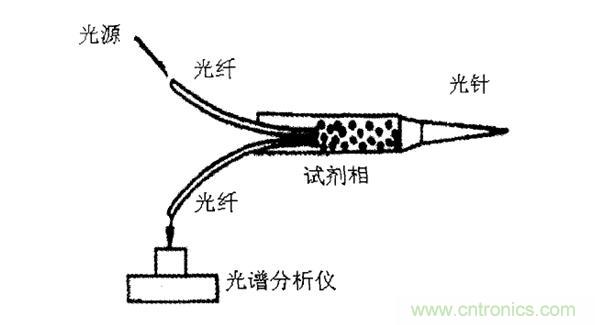 用来测定活体组织和血液值pH光纤光谱传感器示意图,如图5所示。其工作原理是利用发射光、透射光的强度随波长的分布光谱来进行测量。这种传感器将两根光纤插入可透过离子的纤维素膜盒中.膜盒内装有试剂,当把针头插入组织或血管后,体液渗入试剂,导致试剂吸收某种波长的光。用光谱分析仪测出此种变化,即可求得血液或组织的pH值。