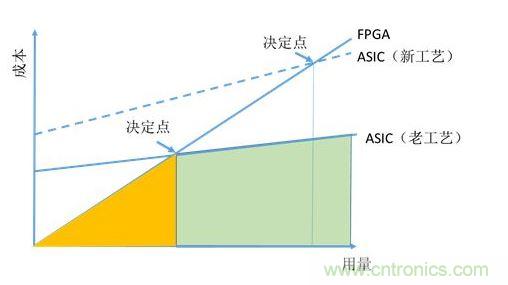 从上图可以看出,FPGA由于没有NRE,在用量较小的时候成本优势明显。由于FPGA单个芯片成本高于ASIC,所以有较大斜率。在决定点位置以后,ASIC开始有成本优势。所以从成本因速考虑选用FPGA还是ASIC,与用量有很大关系。