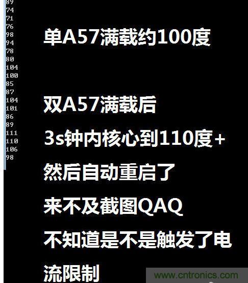 那么810的功耗有多高呢,根据贴吧大神(炮神)ioncannon的分析,在Z9 Max上,810的单核心功耗最高可以达到5W(注意是单核心!单核心!单核心! 重要的事情要说三遍),双核A57同时满载3S就发热达到110摄氏度,并自动重启了,想测试下双核的功耗都以为爆机没办法测试了。