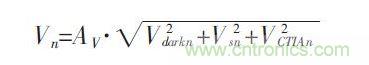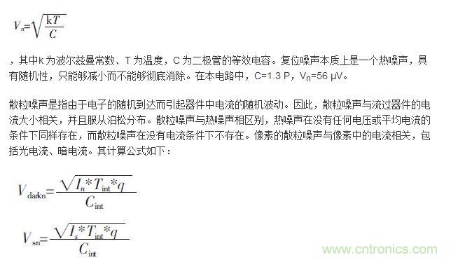 光电流散粒噪声与照度有关,很难消除。与暗电流有关的散粒噪声可以通过改变掺杂浓度减小暗电流,但这会降低量子效率。在本电路中,In=100 fA,Is=20 pA,Tint=20 μs,C int =2 fF,则Vdarkn=0.28 mV,Vsn=4 mV。