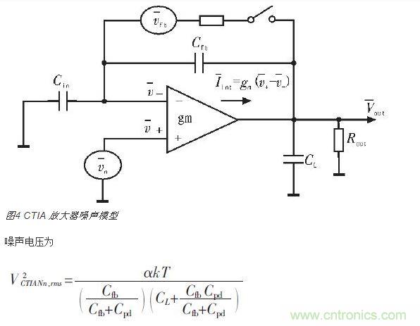 CTIA 读出噪声与输入端电容Cin=Cpd、反馈电容Cfb,以及负载电容CL的设计均有关,其小信号噪声模型如图4 所示。