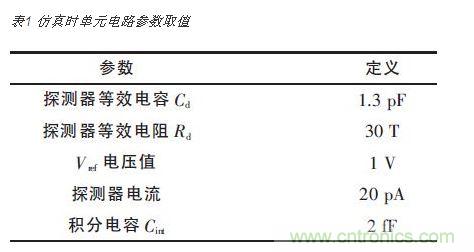 由于C1和C2的作用, 使得Cf在CTIA 反馈回路中的有效值减少,其有效值为:Cfb= ( C2Cf)/(Cf +C1+C2),这样Cf可以取相对较大的值,避免了使用小电容,因为小电容在工艺上较难实现,且误差较大。在本电路中,Cf=20 fF,C2=18 fF,C1=150 fF,则Cfb=2 fF。