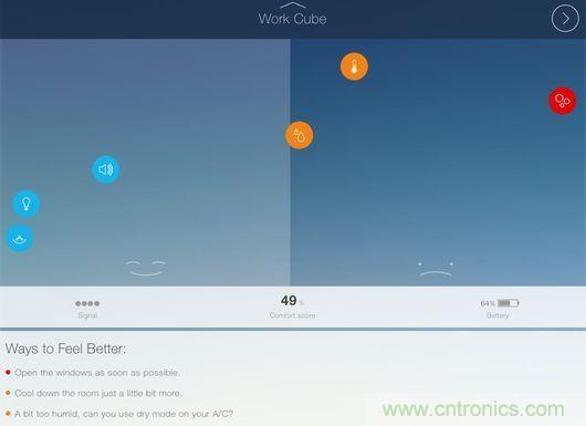 测试人员发现,CubeSensors给出的这些信息较想象中更为有用。例如,产品提示一处起居室的温度有点低,如果适当提升温度会让人感觉更加舒适及放松。而在办公室中,CubeSensors提示改善光照条件能够帮助提升工作效率。在卧室中,产品给出了需要开窗以便改善空气质量的建议。用户除了查看数据之外,还能看到应用给出的实用建议,例如“尽快开窗”或“提升温度会让你感觉更加舒适”。尽管看起来似乎平淡无奇,但CubeSensors背后的团队表示,通过这些小建议,产品可以帮助用户避免罹患感冒、过敏、头疼等症状。