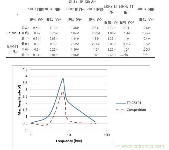 该测试数据将 TPIC8101 与竞争对手的器件进行比较,以显示带通滤波器中的差异如何影响器件性能和 SNR。 TI 器件和竞争对手的器件是按照与表 1 相同的方式进行配置的。