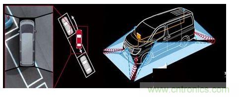 早在2007年,日产就率先在Infiniti EX35汽车上使用了环视摄像头。现在,日产旗下十几款车型(包括小型车Versa Note和紧凑型Rogue SUV)都使用了全景影像监视系统。在汽车前格栅中部装有一枚摄像头,另外两枚超广角摄像头安装在侧视镜边缘,以向下的视角呈现汽车两侧的影像,而第四枚摄像头则安装在车牌上方。系统软件将这四枚摄像头拍摄到的画面拼凑在一起并在中间插入了汽车的俯视图像,看起来像是有一架无人机盘旋在汽车上方,将画面实时地传送到中控显示器上。