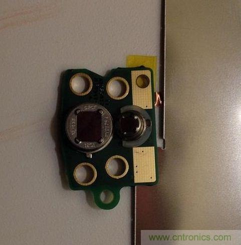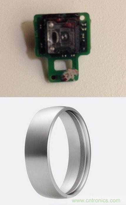 用户可以旋转Nest恒温器的外圈来选择选项。这个光电鼠标上的发射器/传感器组合就是用来检测旋转的器件。外圈内部可以看到光学鼠标元件用来检测旋转的沟槽图案。