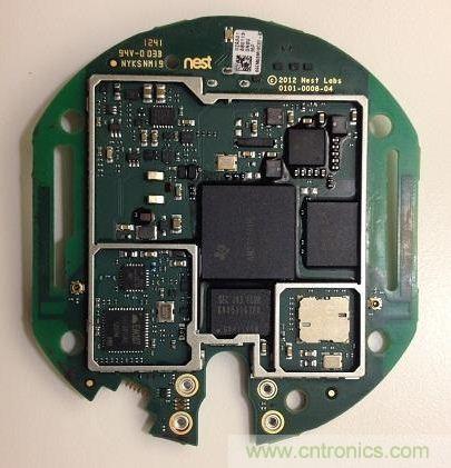 移除Nest恒温器主板的金属屏蔽罩后,可以看到一个德州仪器(TI)Sitara CPU、电源管理和USB芯片、闪存、32Mx16 SDRAM及一个村田(Murata)Wi-Fi模块。此外,还有一个ZigBee网络协处理器,表明该器件将来可以进行扩展。