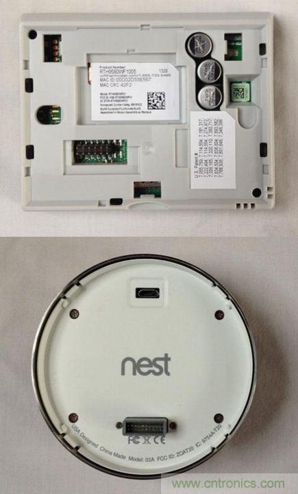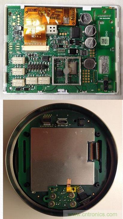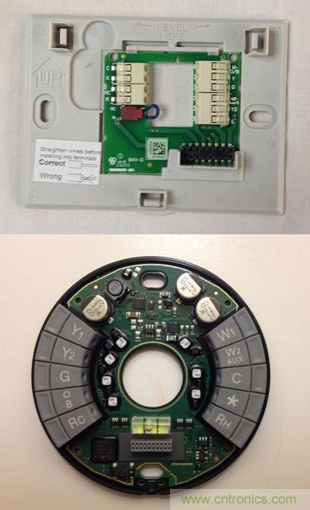 霍尼韦尔恒温器的单个PCB上包括多个DC-DC转换器、稳压器和整流器、一个8通道12位ADC、128MB SDRAM、32M闪存和博通(Broadcom)Wi-Fi模块(屏蔽罩移除)。主处理器是爱特梅尔(Atmel)926 ARM处理器,外面包覆了金属屏蔽罩,仅在扁平带状电缆至显示器下方可见。Nest恒温器的主要电子元器件全部被包覆在单个屏蔽罩下??拷撞康牧礁龈郊拥缏诽峁┘觳夤δ?。PCB与显示器通过螺丝固定,金属环被卡在两者之间,但可以自由旋转。