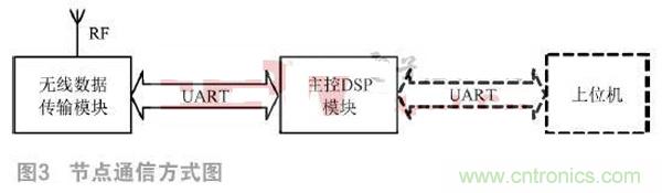 在传感器网络中,采用ZigBee通信协议时,节点被分为Coordinator、Router以及End Device三种。Coordinator负责系统的初始化工作,选择网络的信道等参数建立网络,供其他节点加入;Router负责节点之间命令消息的路由转发实现;End Device负责任务是消息的发送和接收,只能和父节点进行数据通信,不具有路由转发的功能。在本系统中,Sink节点主要负责监控网络的建立、上位机命令的分析处理和操作、数据的收集等任务,是整个网络的数据存储和处理中心,在上位机和监控网络之间起到桥梁的作用,是系统应用中的Coordinator。监控网络区域内的待定位节点要具备消息转发与路由其他节点的能力,需要可以给所有节点发送消息,也可以接收到所有节点的消息,是系统应用中的Router。每个节点由无线数据传输??楹椭骺谼SP??樽槌桑唤诘愕牧礁瞿?橹渫ü齍ART总线进行通信。节点之间通过无线RF射频方式进行通信。Sink节点与上位机使用UART总线进行通信,未知节点的通信方式中并不包含该通信方式。节点的通信方式如图3所示。
