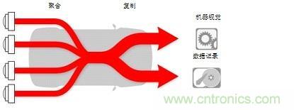 前置机器视觉摄像头更是需要多个副本,但它将很快适用于自主车辆的附加摄像头、雷达和光线检测/测距(LIDAR)传感器。数据记录是一个当今非常常见的复制应用(图1)。在机器视觉应用中,通常记录某些行车状况的原始传感器数据,以用于未来分析。这种情况下,拥有聚合原始传感器数据的第二副本,并将其用于数据记录,是大有裨益的;而另一个副本则用于机器视觉处理。