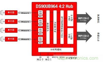 图3所示为四摄像头系统,具有由彩色块所示的不同数据速率。聚合数据在移动工业处理器接口(MIPI)摄像头串行接口(CSI)-2端口0和1两者处呈现。CSI-2总线具有“突发性”,意味着其以固定数据速率运行、将发送数据为可用状态,并且当机器空闲时恢复到低功率(LP)状态。因此,传感器速度可在不改变ECU处理器时序的条件下进行变化。即使传感器链路以独立频率运行,解串器集线器在单个参考时钟上也可将数据提供给片上系统(SoC)处理器,从而简化系统时序。