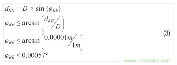 回过头看图2中的应用示例,将公式1和公式2结合便可把重要标准(检查表面上的物理失真)与MEMS陀螺仪数据手册通?;崽峁┑脑肷阅苤副辏≧ND、ARW)关联起来。在此过程中,假设公式1中的积分时间 (τ) 等于图像捕捉时间可提供进一步且很有用的简化。公式3利用公式1中的一般关系来估 计,当摄像头距检查表面1米 (D) 且最大容许失真误差为10μm (dRE) 时,陀螺仪的角向误差 (φRE) 必须小于0.00057°。