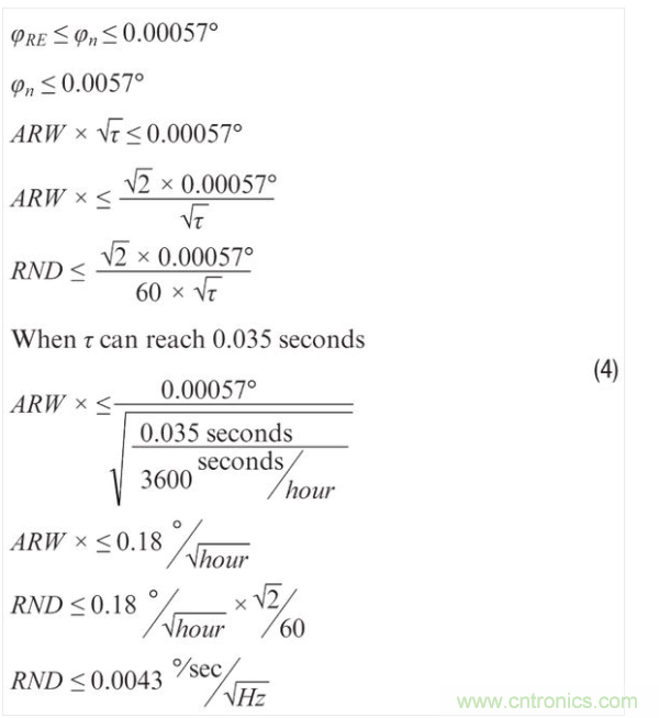 公式4将公式3的结果和公式2中的一般关系相结合,用来预测特定情况下对MEMS陀螺仪的ARW和RND要求。该过程假设图像捕捉时间35 ms等于公式2中的积分时间 (τ),因而可以预 测,为了达到要求,陀螺仪的ARW需要小于0.18°/ hr,或者RND必须小于0.0043°/sec/ Hz。当然,这可能不是这些参数支持的唯一要求,但这些简单的关系提供了一个例子,告诉我们如何将其与已知要求和条件联系起来。