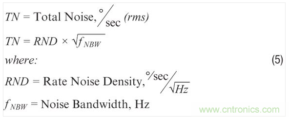 提供连续指向控制的系统开发者可能更愿意从角速率方面来评估噪声影响,因为他们可能没有固定的积分时间来利用基于ARW的关系。从角速率方面评估噪声常常要考虑RND参数和陀螺仪信号链的频率响应。对陀螺仪频率响应影响最大的常常是滤波,其支持环路稳定标准的专用要求,并能抑制对 环境威胁(如振动)的不相干传感器响应。公式5给出了一种简单方法来估算与特定频率响应(噪声带宽)和RND相关的 噪声。