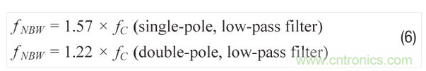 当RND的频率响应遵循单极点或双极点低通滤波器曲线时, 噪声带宽 (fNBW) 和滤波器截止频率 (fC) 将有公式6的关系。