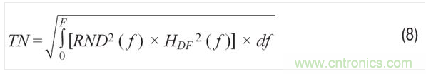 若系统需要定制滤波,其频率响应 (HDF(f)) 不符合公式6和7中的简单单极点和双极点模型,则可利用公式8提供的更一般关系来预测总噪声: