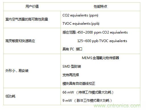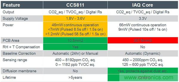 和CCS801相比,CCS811继承了其很多优点,如:出色的感测范围与精度、支持长达5年寿命的特殊工艺等等。而两者最大的差异在于,CCS811是一个数字VOC传感器,其内部集成了一个MCU,可以直接对传感器的驱动和测量进行管理,并通过一个I2C接口与外部进行数据通信。虽然集成了更多的功能,CCS811仍然保持了相当“纤细”的身材,采用2.7 x 4.0mm的LGA封装,使得PCB占板面积可以节省60%,节省了BOM成本。同时,由于内部还集成了相应的算法,使得终端产品的开发也得以简化,进一步降低了整体的成本。想必消费类用户看到下面这个CCS811的性能清单,会非常动心。