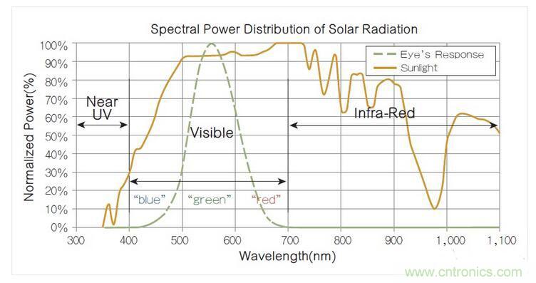 图1 太阳光的光谱功率分布,其中的强功率红外线成分对人眼而言是不可见的。